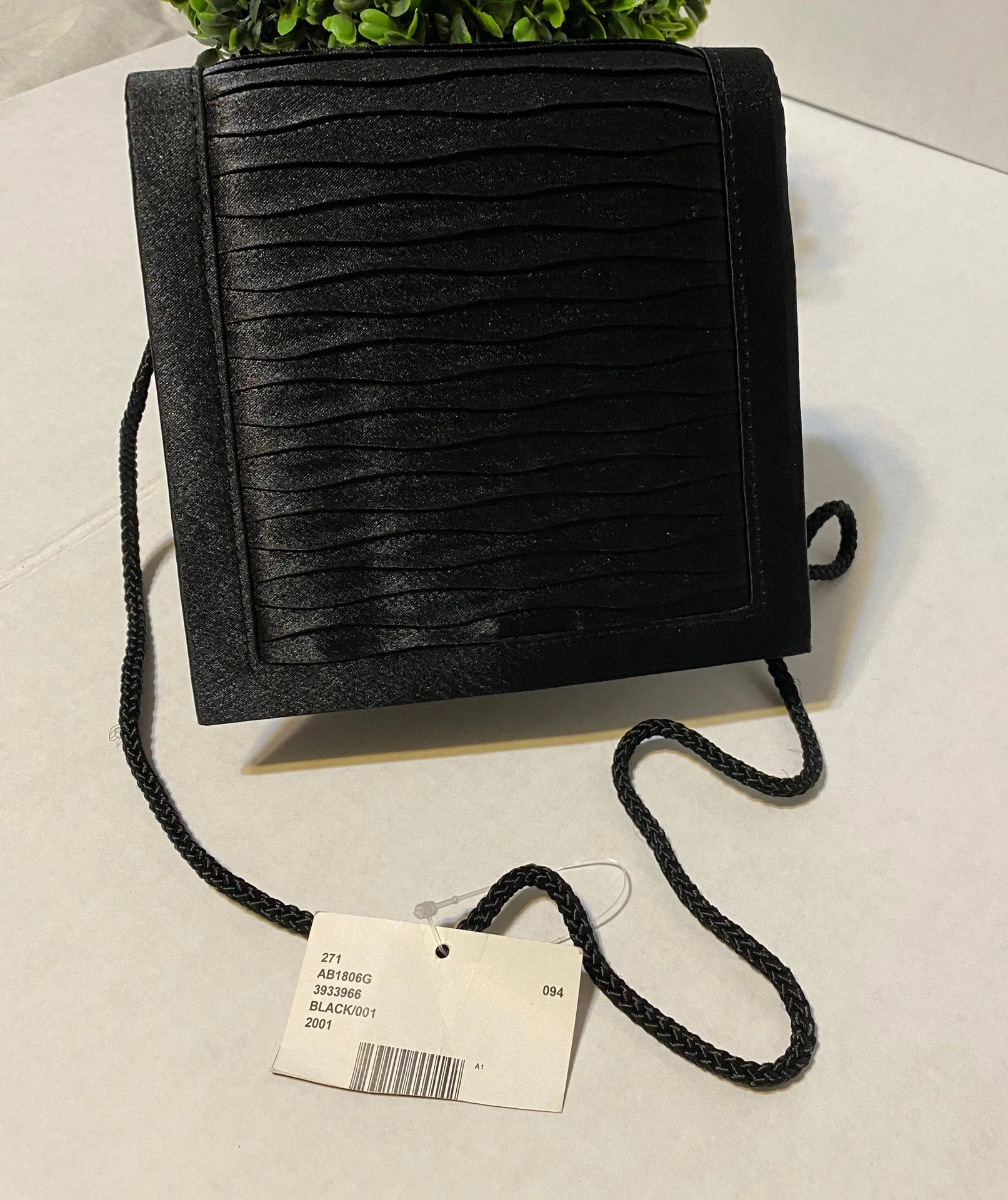 Pleated Clutch Evening Envelope Bag Satin Evening Bag With Gorgeous Crossbody Box style clutch black purse. Tailored pleating and a thin chain strap dress up this classic evening clutch. * chain strap, 17¾" drop * magnetic closure * satin * interior credit card pocket * 4⅛Hx10⅛Wx10 • Color: Black •Tag Size: OS •NEW WITH TAGS •No Flaw LOC#798ACCESS