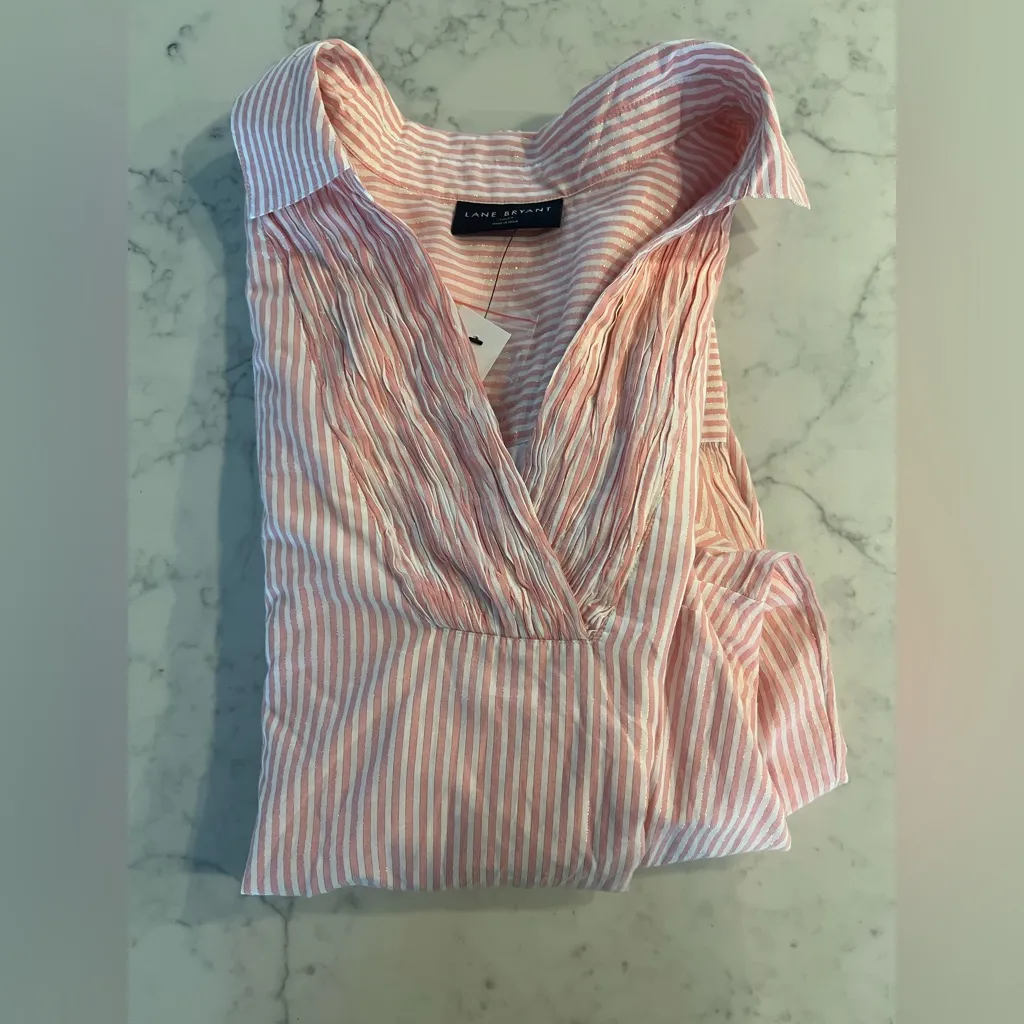 The Lane Bryant tunic top in size 22/24 is a stylish peach and white blouse with hints of gold desig... Show more