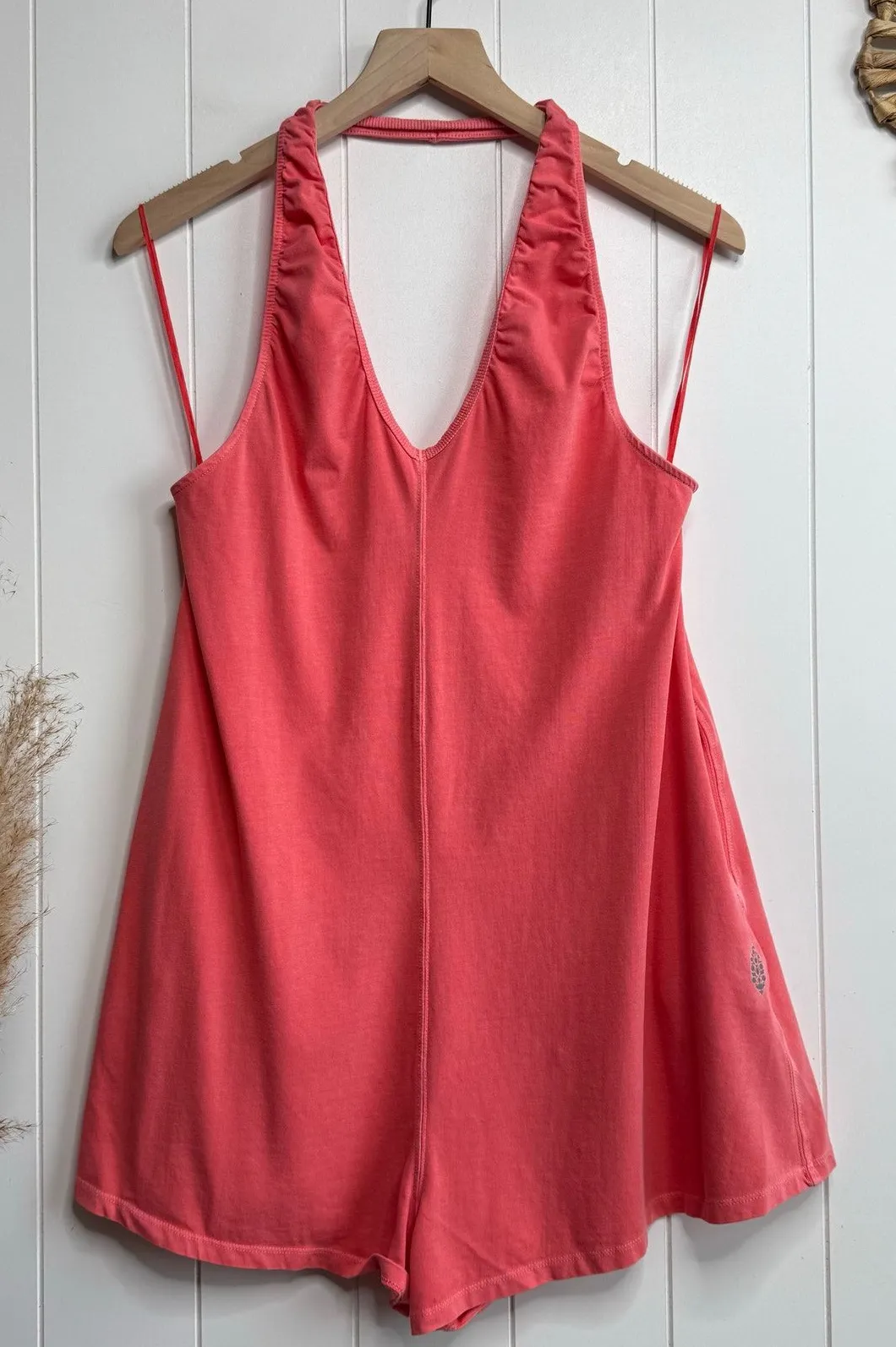 Condition: brand new without tags. Brand tag marked by the retailer to prevent returns. Size: Small Pit to pit: 15" Waist; 36" Length: 29" Inseam: 2" Fabric: 95% cotton 5% elastane Color: between pink and orange (like grapefruit) Relaxed fit; romper silhouette; halter neck; open back; shorty length Smooth, soft fabrication is lightweight and breathable; shorty length; halter neck; zippered back pocket; open back; side seam pockets Tags: boho, bohemian, romper, one piece, onesie, trendy travel vacation resort cruise beach lounging overalls coveralls fashion activewear sportswear hiking outdoors hot shot halter romper summer spring casual