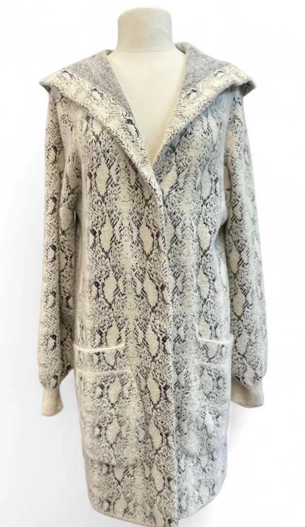 Snake print snap closure cardigan sweater Fuzzy Knit Hooded Cardigan Sweater BUCKLE BLACK ITEM NO.... Show more