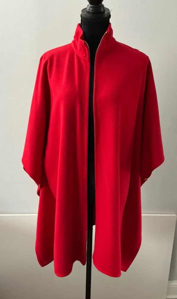Stunning/ ultra ELEGANT soft knit cape/ cardigan in lipstick red( not as bright in person as looks in pics) in absolutely pristine condition. 27” between seams- I believe fits up to size LARGE lady. Very beautiful, modestly dressy piece will brighten up any boring outfit and will keep you warm.