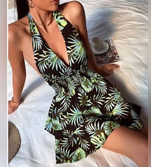 Madden NYC black tropical print tiered smocked halter dress size medium NWT - $20 (71% Off Retail) New With Tags - From Upstyle