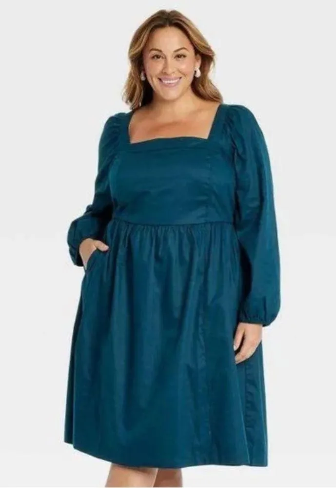 Questions? Leave a comment below! Ava & Viv - Women's Balloon Long Sleeve Woven Midi A-Line Dres Blue •Balloon long-sleeve A-line dress •Midweight woven fabric •Square neck •Smocked back with tie •Seam pocket •Midi length Look and feel your absolute best wearing this Balloon Long-Sleeve Woven Midi A-Line Dress from Ava & Viv. This midi A-line dress features balloon long sleeves, a cool square neckline and a smocked back with a tie closure for a flattering silhouette. Plus, it comes complete with a seam pocket to help keep your coins, phone or other items handy. The midweight woven fabric offers a comfortable drape, and you can pair it with your fave accessories and sandals to complete the look. Sizing: Womens Plus Material: 55% Cotton, 45% Lyocell Garment Style: Long Sleeve, Pullover Fabric Name: Woven Neckline: Square Garment Length: Midi Total Garment Length: 38 Inches Garment Details: Seam Pocket, Smocking Garment back type: Square Fabric Weight Type: Midweight Fabric Garment sleeve style: Balloon Sleeve Care and Cleaning: Machine Wash, Tumble Dry Like Comment L7 Share