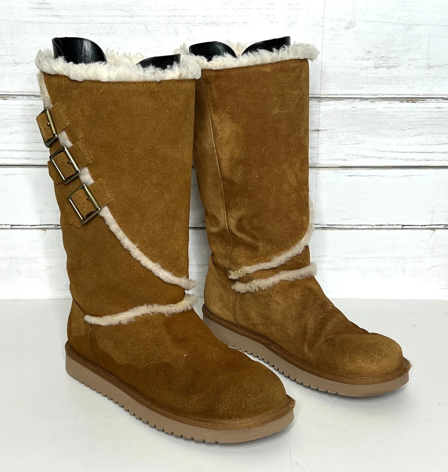 Koolaburra by UGG Shara Tall Boot Round Toe Pull on Buckle detail Shearling lined Chestnut brown suede Shoe Size 10 1114690 See side of right boot for slight discoloration Tags: winter, warm, cozy, trendy, stylish, outerwear, buckle detail