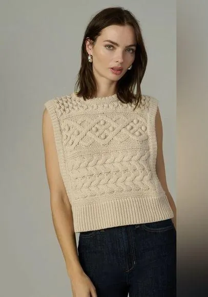 Sleeveless sweater in a classic, modernized cable knit. Crew neckline Sleeveless Chunky gauge knit Horizontal cable knit Slightly cropped fit Style: JWFA7175 Soft cotton-blend yarn 60% COTTON, 40% ACRYLIC Armpit to armpit 16.5” Length 20” Questions? Leave a comment below!