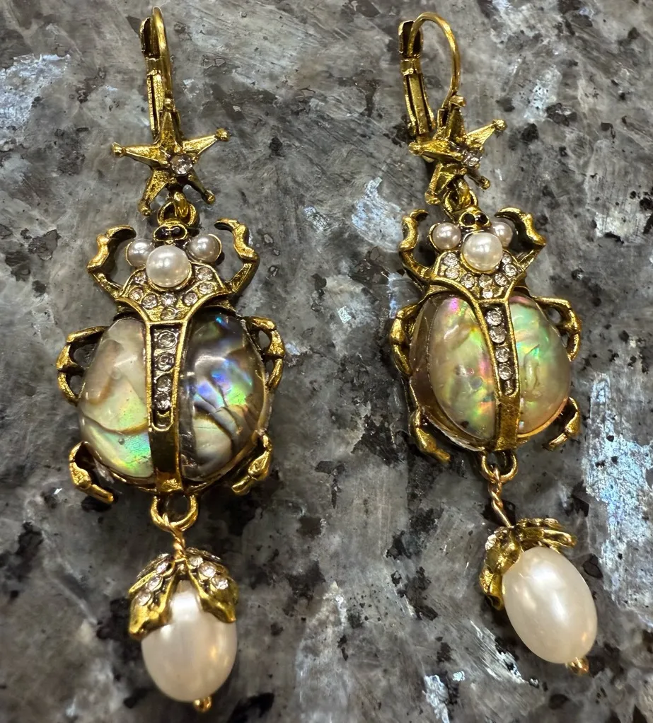 These stunning gold beetle earrings feature iridescent abalone shell accents and pearl drops, along with rhinestones, perfect for adding a unique touch of elegance to any outfit.