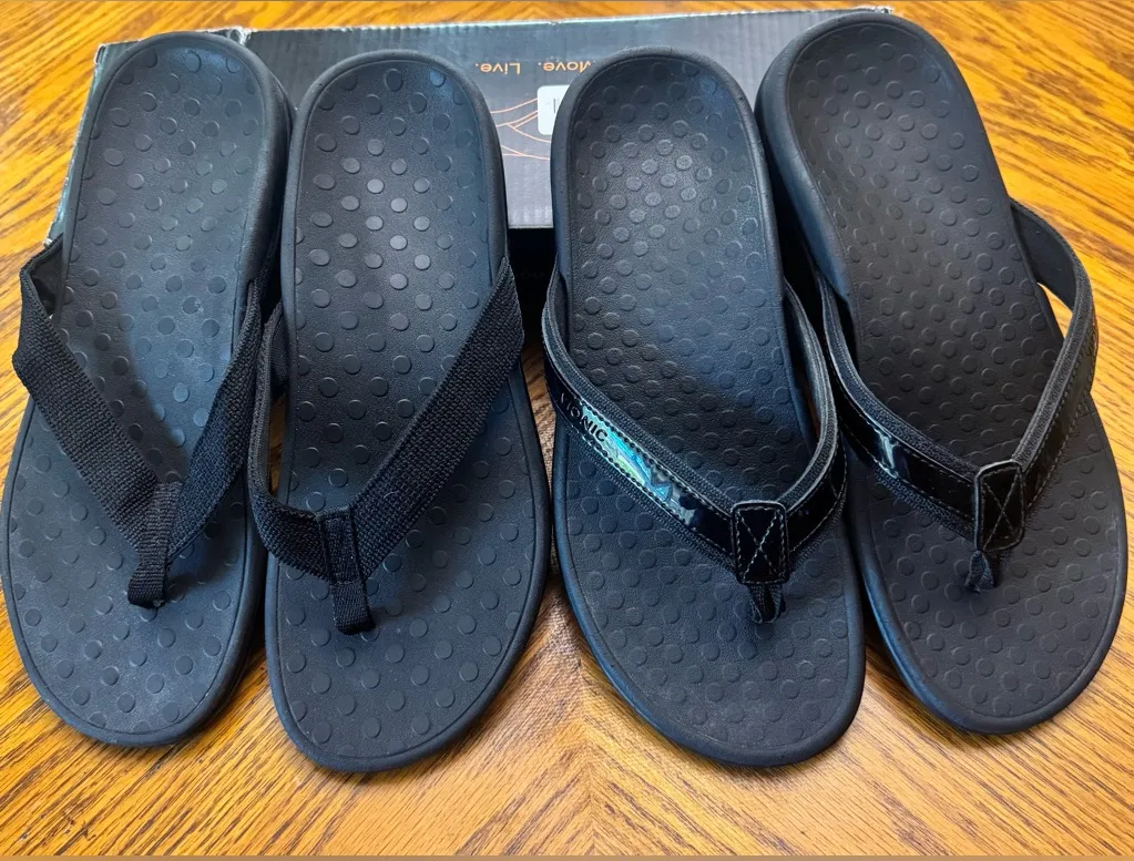 Set of 2 black flip flops with textured soles. Comfortable and stylish. One pair is vionic the other no brand flip flop No mayor wears show but the size tag in the vionic pair is faded please check pictures Descriptions for the vionic pair Vionic Tide II Flip Flop Slide into a comfortable thong sandal from Vionic to complete your warm weather look! Simple and stylish, these casual flat sandals will become fast favorite summer! Item # 338927 UPC # 616542154127 FEATURES Leather & fabric or cork upper Slip-on Round open toe Fabric lining Podiatrist-designed contoured footbed with Orthaheel® technology Flexible rubber sole Imported