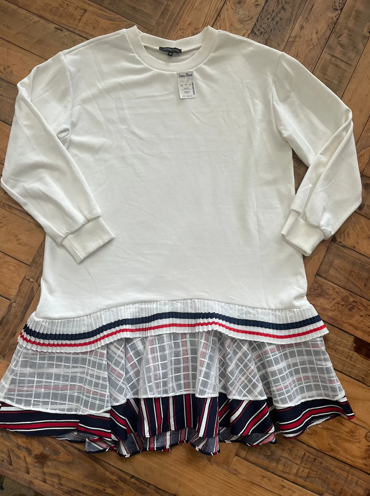 FEATURES New with tags! Tunic features a pull on entry, over sized silhouette, sweat shirt style top (that is not fleeced), and a ruffle accent drop waist. FLAWS N/A BRAND CQ by CQ TAG SIZE Medium COLOR Hues of Red, Navy and White, SHELL FABRIC See Tag Photo APPROXIMATE MEASUREMENTS OF SHELL Bust/Chest (armpit to armpit across, laying flat): 23" Waist (across, upstretched, laying flat): 22" Bottom Hem/Hip (across, laying flat): 24 Sleeve Length (neck to cuff): 28" Sleeve Openings/Cuff (across, laying flat): 4.5" Length (shoulder to hem down back): 36" Shoulder (across the back): 21"