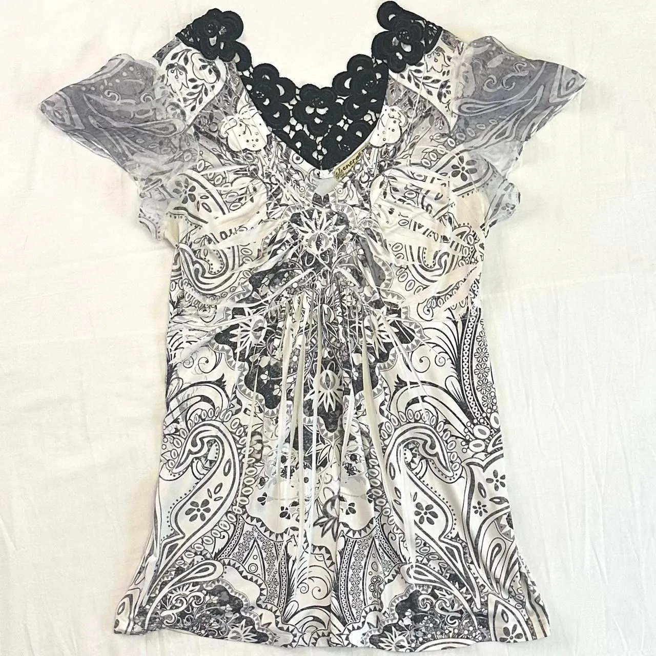 2000s energe unity world wear black and white floral paisley print top with rhinestones along the neckline, flutter sleeves, and floral lace on the back, size petite small super cute on, the back is so unique in very good condition, no noticeable flaws MEASUREMENTS: pit to pit 15in flat across, length 24in #emo #goth #alt #grunge #y2kvintage