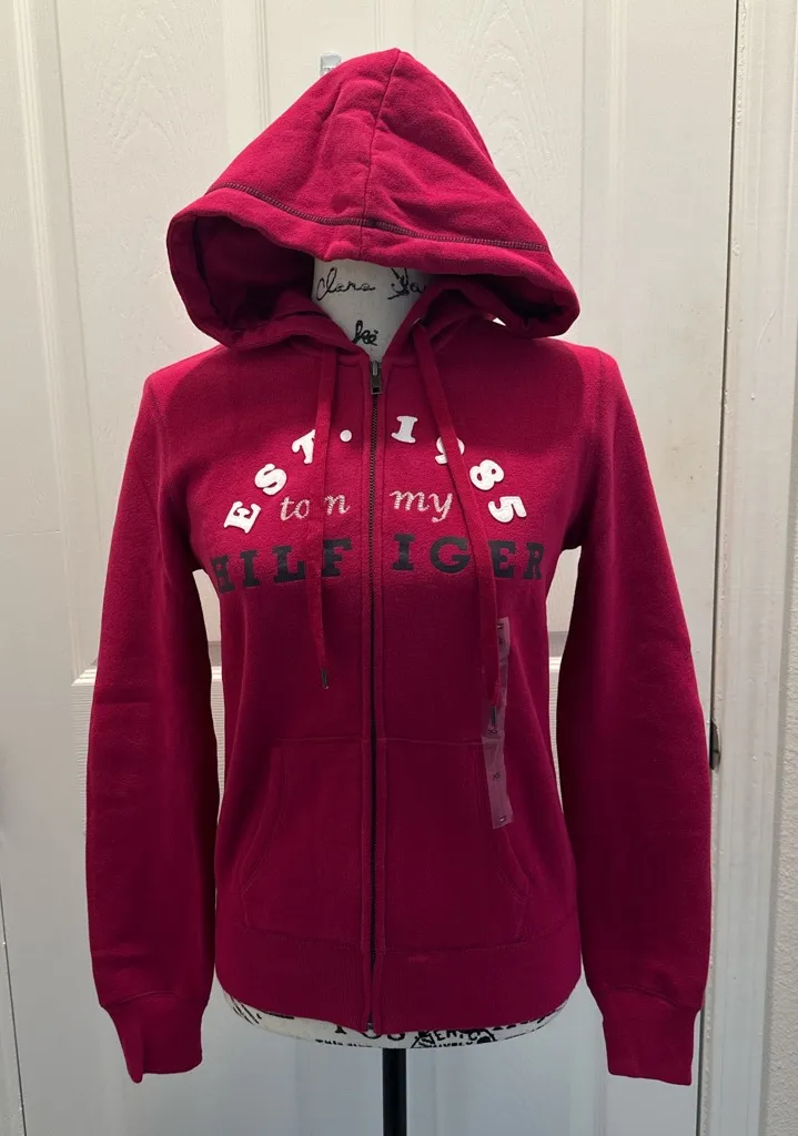 Dark Fuchsia hoodie with front logo. Features drawstring hood and zip closure. NWT and never worn.... Show more