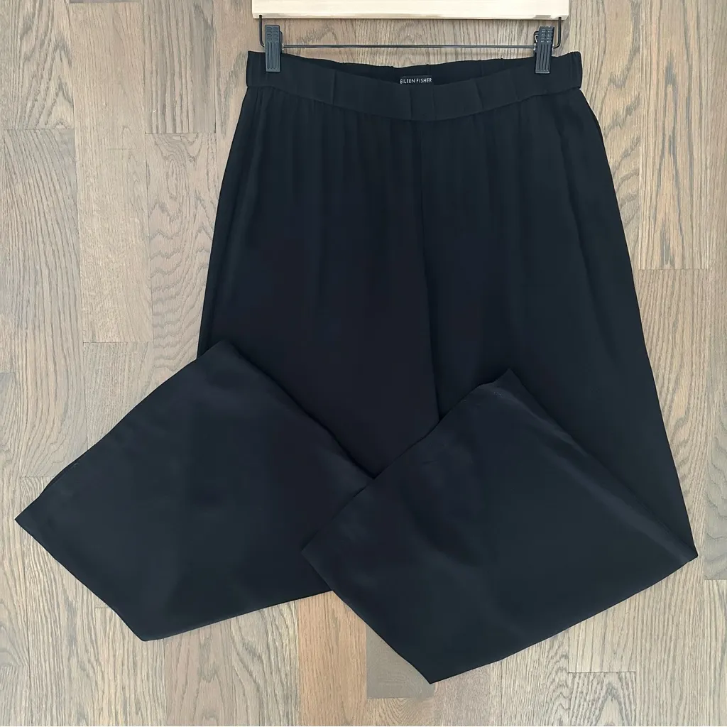 Eileen Fisher silk elastic high waist wide leg pant. In black. Elastic waist, gathered at waist, no... Show more