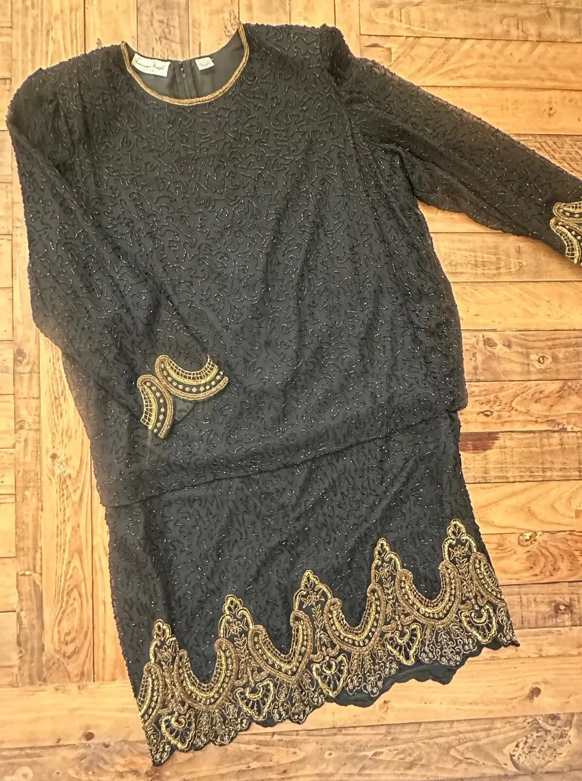 FEATURES Dress has been gently worn with no major stains, snags or tears! Dress features a back zipper entry, built in shoulder pads, long sleeves, all over beading, drop waist silhouette and it is fully lined. FLAWS N/A BRAND Laurence Kazar TAG SIZE 2X COLOR Black and Gold SHELL FABRIC 100% Silk with beading
