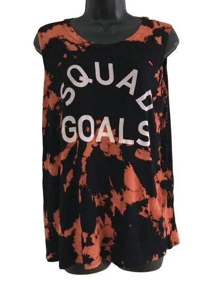 This is a bleach dyed black ladies tank top that I have altered myself. I bleach tie dyed piece to give in a unique look. The shirt says Squad Goals and is a rayon/spandex blend. It is marked as a size medium, but it's long and oversized so will fit a large as well. | MEASUREMENTS | Shoulders: 14" Bust: 40" Waist: 40" Length: 29” Material: 97% Rayon 3% Spandex Condition: Excellent, this piece has been intentionally bleached and is structurally in great condition, no flaws.