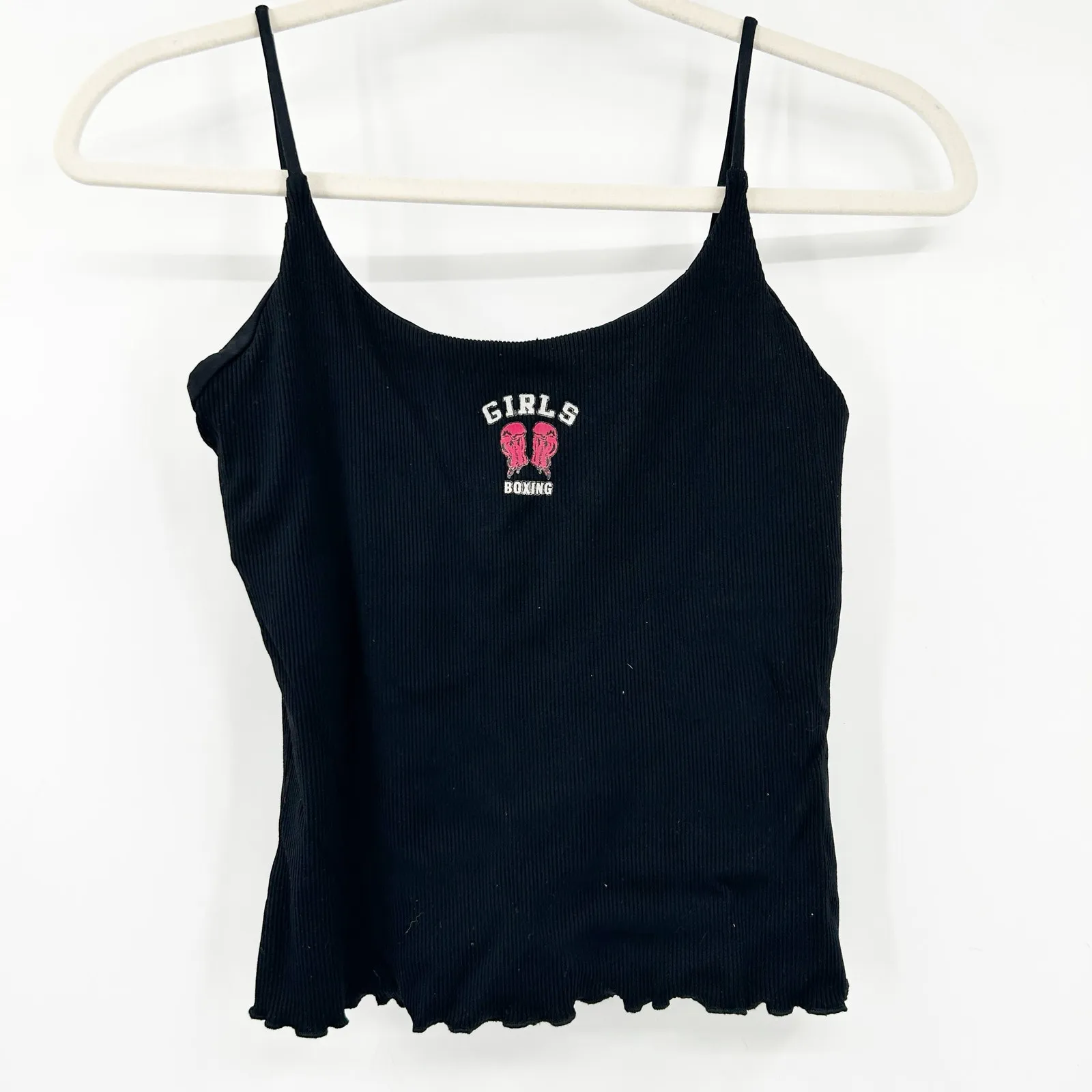 24 Hour Fitness Womens Y2K Athleisure Active Girls Boxing Shelf Bra Cami Tank Top in Black. Size Large. Good preowned condition. No visible flaws. - Girls Boxing Gloves Graphic Print - Ribbed Fabric - Scoop Neck - Sleeveless - Spaghetti Strap - Shelf Bra - Lettuce Hem - Stretch - Baby Tank - 90% Nylon, 10% Spandex Tags- Y2k 2000s Boxing Gym Athleisure Active Athletic Sporty Performance Workout Approximate Measurements While Laying Flat: Pit To Pit: 13.5" Length: 18" All Items Come From A Smoke Free Home ! All Reasonable Offers Welcome !