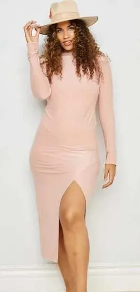 Sculpt your silhouette in this stunning NAH WE ARE midi dress. Designed to hug your curves with a flattering mock neck and long sleeves, this dress features a daring side slit that adds a touch of allure and effortless movement. The rich peach beige hue creates a sophisticated and warm aesthetic, perfect for making a statement. Elevate your look for a chic dinner date or a stylish evening out. Measurements: • Bust: 17.5" • Waist: 16" • Length: 50" Style: Bodycon, Maxi Dress Length: Asymmetric Department: Women Sleeve Length: Long Sleeve Pattern: Solid Occasion: Party/Cocktail, Casual Material: Polyester, Spandex Fabric Type: Jersey Neckline: High Neck Season: Spring, Fall Sleeve Type: Long Sleeve Closure: Pullover Accents: Ruffle Features: Side Slit, Cut Out Keywords: mock neck dress, long sleeve dress, side slit dress, midi dress, stretch dress, elegant dress, sophisticated, evening wear, date night, cocktail dress, bodycon dress, minimalist