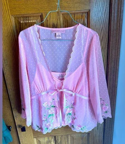 Very pretty, feminine set. Sheer pink, polka dot with scallop edge. Floral embroidery. Ribbon tie close front. Matching pink spaghetti strap tank. 3/4 length sleeves Bandolino Size 14 See all photos. In excellent preowned condition.