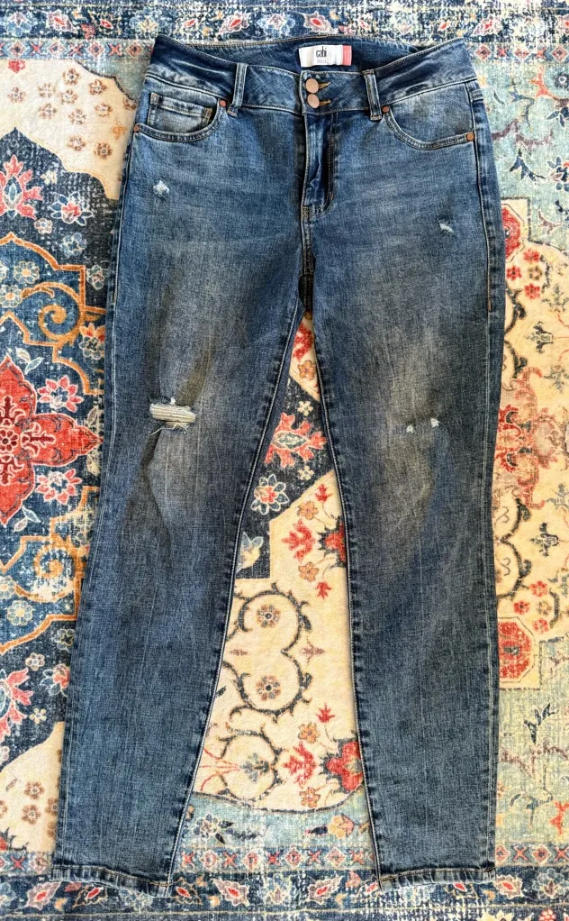 Classic straight leg jeans. Subtle distressed details. Perfect for everyday wear.