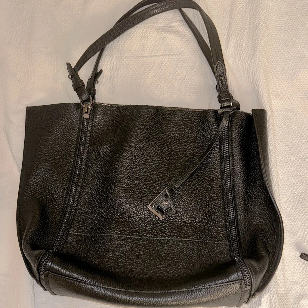 Slouchy, wrinkled leather lends a rich element to this Botkier tote. Separated zippers trim the outer seams, and a logo stamp trims the base. Slim top straps fit over the shoulder, and the metallic interior contains 2 pockets. Gunmetal-tone hardware. Laser-cut top line Double handles Magnetic snap closure; unlined Two interior slip pockets, interior zip pocket Zipper trim on exterior Leather Height: 13in X Length: 18in X Depth: 5in Handle drop: 10in COLOR : BLACK/GUNMETAL STYLE : 18S0051XHPBKS ORIGINAL PRICE : $298.00 IMPORTED. Excellent condition!