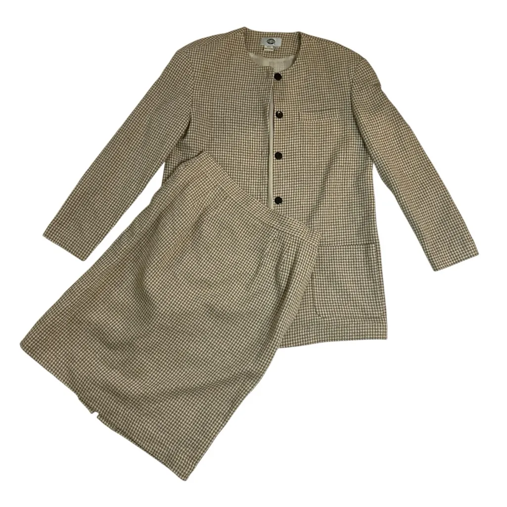 Vintage silks brand 100% silk blazer with a brown houndstooth pattern. Features a classic button detail. This vintage 90s two-piece skirt suit by Silks is crafted from 100% pure silk and made in Hong Kong, showcasing timeless tailoring and elegant fabric quality. The set features a houndstooth blazer with a round neckline, button closure, and structured fit, paired with a matching pencil skirt fully lined for comfort. A perfect choice for collectors of vintage silk, minimalists, or lovers of 90s office-to-evening fashion. Wear together as a coordinated power suit or style the pieces separately for endless wardrobe versatility. Details: Brand: Silks Size: Medium Material: 100% Silk (fully lined) Pattern: Brown & beige houndstooth Era: 1980s–1990s Made in Hong Kong Condition: Excellent vintage - never worn by me personally, pre-owned status vintage silk suit, 90s blazer skirt set, made in hong kong clothing, vintage houndstooth silk, womens silk skirt suit, vintage office wear, silk two piece set, 90s minimalist fashion, vintage power suit, silk blazer set, secretary vibes