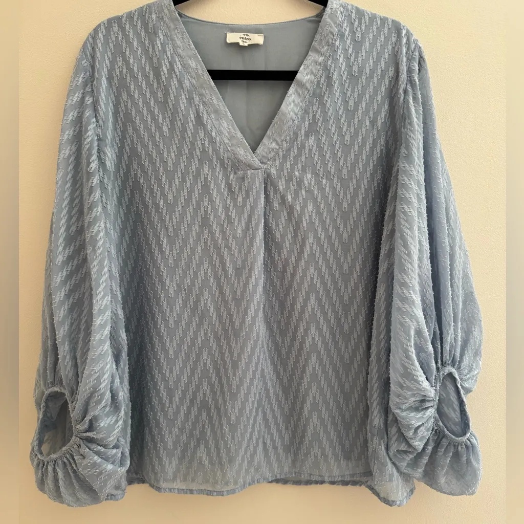 Entro women’s blue blouse with textured chevron pattern in a size large. Features a v-neck and styli... Show more