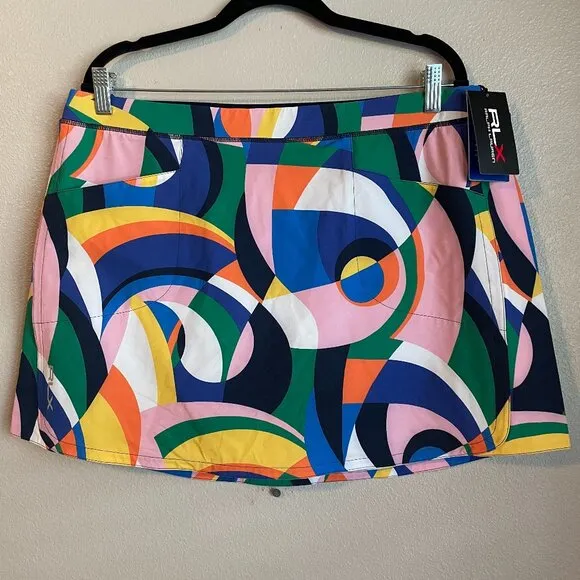 This RLX Ralph Lauren Print Performance Skort is perfect for any active woman who wants to look stylish on the golf course or tennis/pickleball court. The skort features a colorful geometric pattern, pull-on closure, and flat front design. It is made of 86% polyester and 14% elastane, making it stretchy and comfortable for any activity. The skort also has pockets and the RLX Ralph Lauren logo as accents. It is machine washable, making it easy to care for. This skort is ideal for summer, fall, and spring seasons and is available in XL size. Get ready to impress your golfing friends with this athletic and stylish skort.