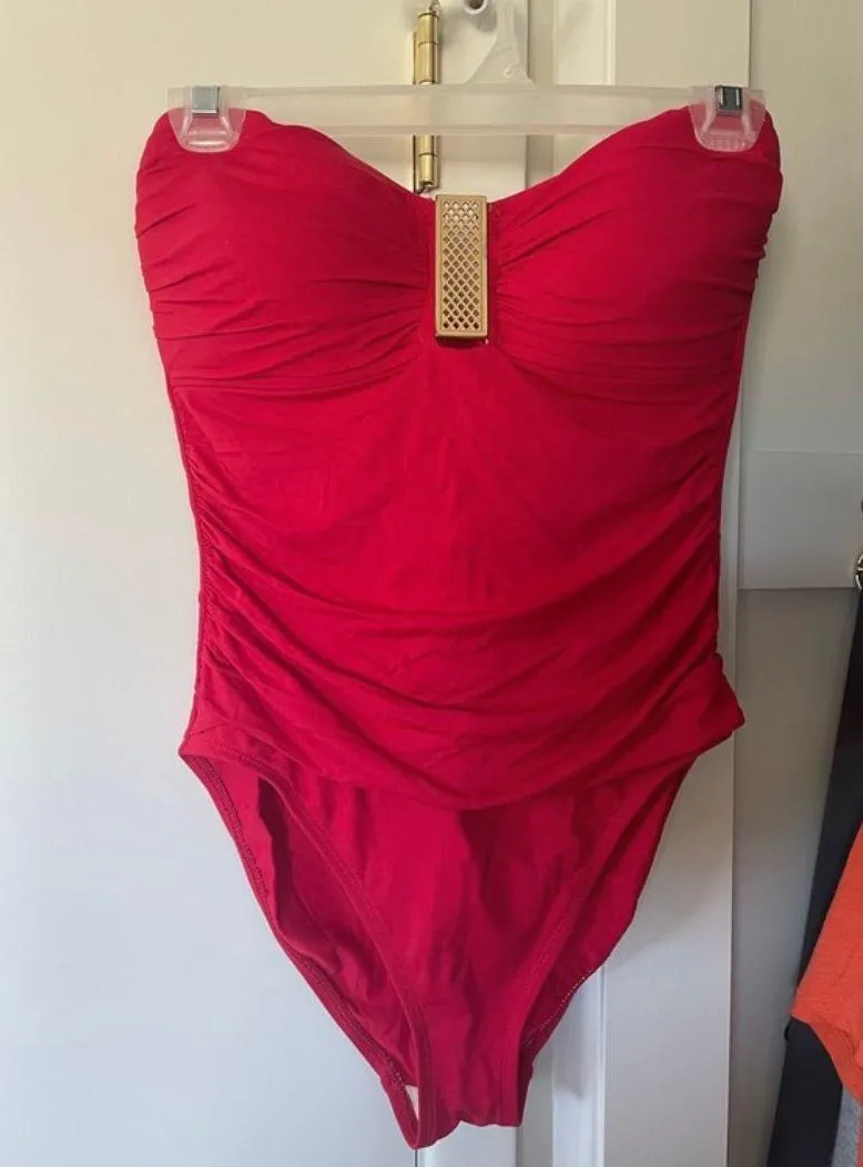 La Blanca one piece swimsuit -Red One Piece Swimsuit with Gold Detail. La Blanca Island Goddess Bandeau One-Piece Flattering ruching/shirring at front Sewn-in molded cups Tummy control panels Moderate rear coverage 91% nylon, 9% elastane Bandeau top w/removable halter strap Tummy Control • Color: Red •Tag Size: 10 •NEW WITHOUT TAGS •Flaw-needs straps LOC#875 *Approximated Measurements are taken while laying the garment flat (one side) •Armpit to armpit:16” •Length (collar seam-bottom hem): 23