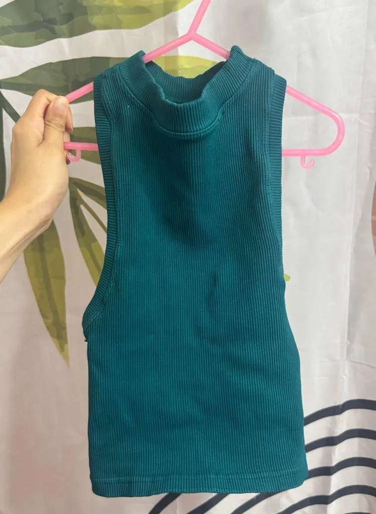 Free People Movement Ribbed Tank Top M/L Green High Neck Mock Neck Bought this from a batch of free people Misprints, see internal logo misprint and no fp exterior logo. Some fuzzies and stitching imperfections shown in photos Color is hard to capture due to lighting factors, please expect a variation of what u see on your screen