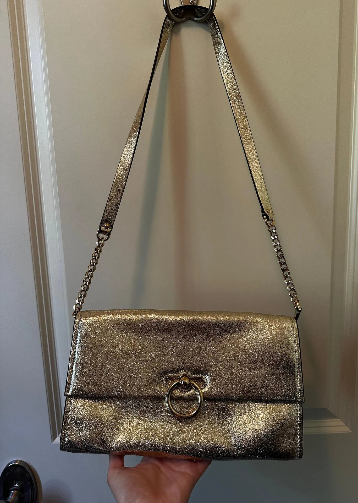Rebecca mink off purse Gold with gold strap and chain Only used twice Credit card slots in interior... Show more