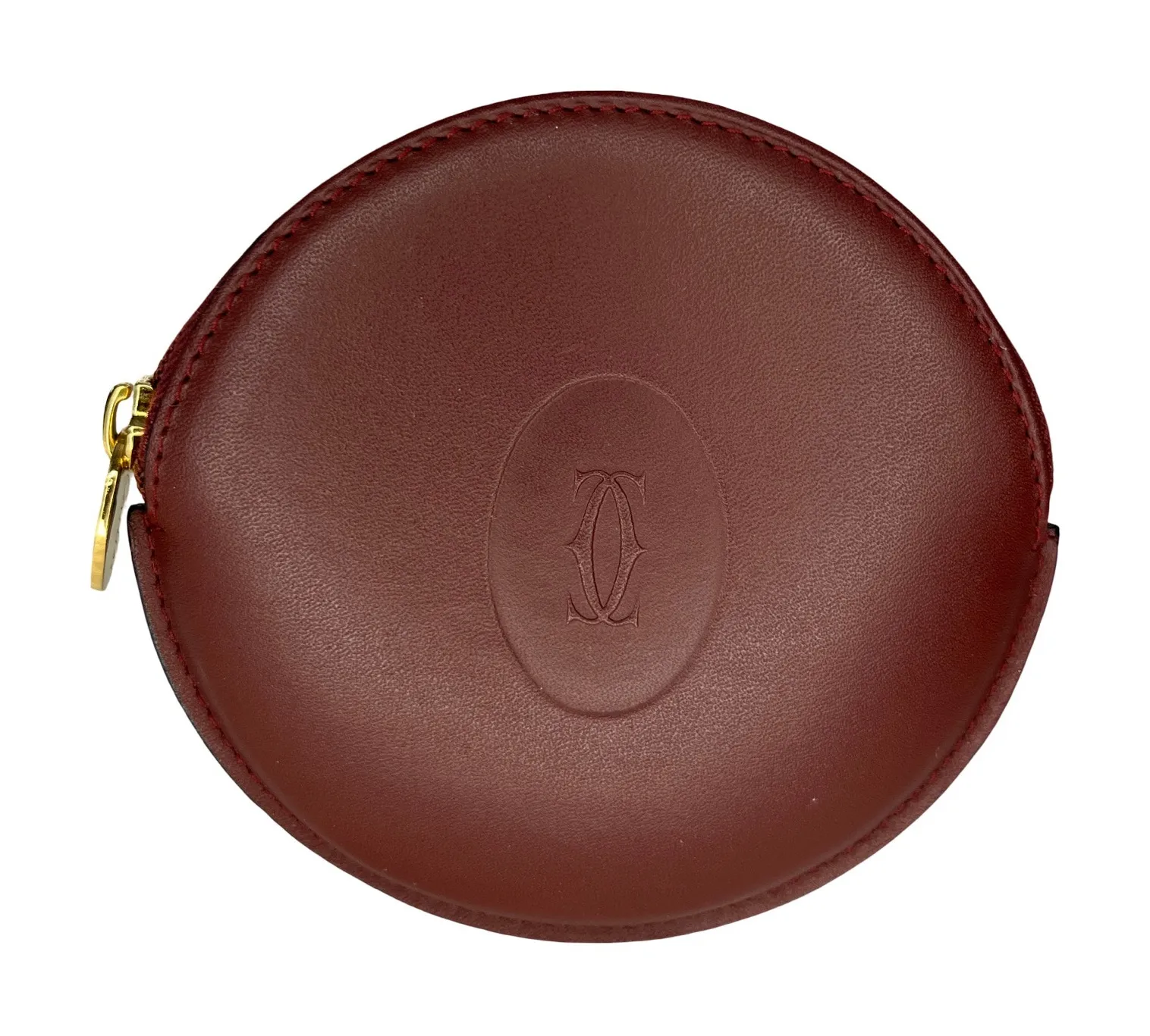 Elegant and rare Must de Cartier vintage round coin purse in signature Cartier bordeaux calfskin leather. Features gold-tone zipper hardware with Cartier logo pull and embossed Cartier double-C logo on front. Lined in smooth leather with “Cartier Paris” gold stamp inside and serial stamp “L25 MADE IN SPAIN.” A timeless collectible piece—perfect for storing coins, AirPods, or small essentials in luxe style. An ideal accessory for Cartier collectors and vintage lovers alike. Details: • Brand: Cartier (Must de Cartier) • Style: Round zip coin purse / mini pouch • Color: Bordeaux / oxblood • Material: Smooth calfskin leather • Hardware: Gold-tone zipper with Cartier logo pull • Interior Stamping: “Cartier Paris” and serial “L25 MADE IN SPAIN” • Made in Spain • Condition: Excellent vintage condition with minimal wear Cartier, Must de Cartier, coin purse, mini pouch, Bordeaux leather, oxblood, French luxury, collectible leather, vintage Cartier, logo coin case, designer accessory, small leather goods, SLG, Cartier Paris, luxury gift, authentic Cartier