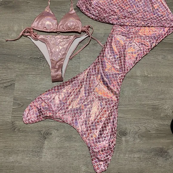 Shimmering pink triangle two piece bikini swim suit mermaid bikini set with a pink iridescent mermaids tail bottom cover up. Includes a triangle top, tie bottom and mermaid tail cover. All size large. Never worn. Tail measures 54” from waist to floor. Waist is elastic and is 26” at its smallest, and can go up to 44”