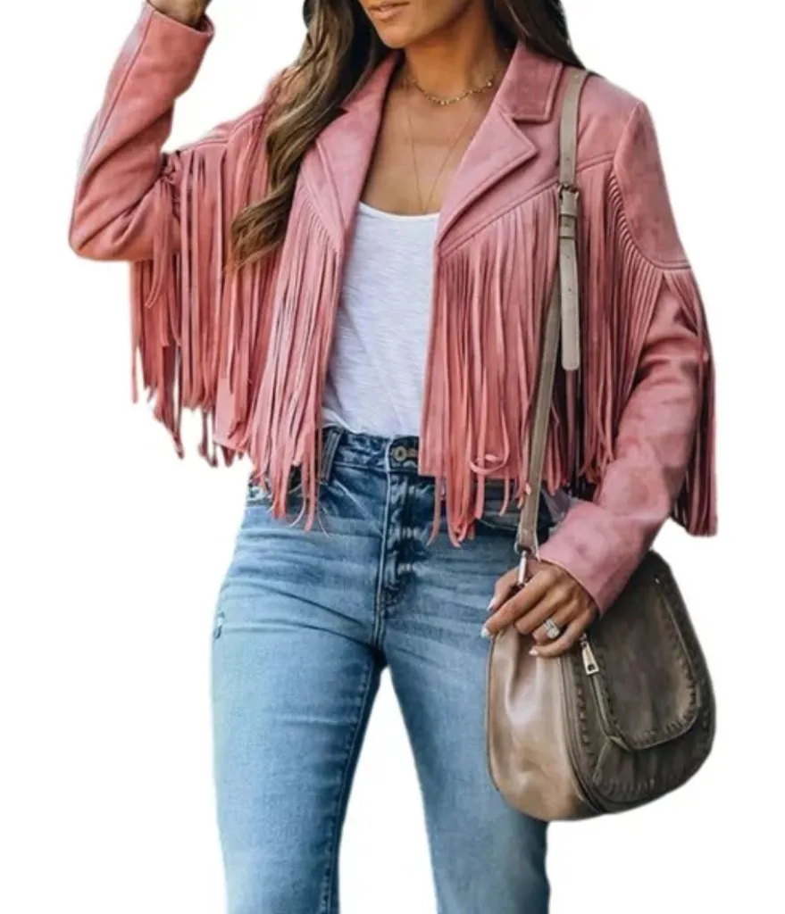 Stunning Good Vibes Cropped Faux Suede fringed Moto Jacket in gorgeous Mauve comes to you in a size large. Sending out those Western vibes, this epic look is unforgettable in premium faux suede. Constructed to fit true to size and cropped with a notched collar. Fringe trim details the look for a final touch.