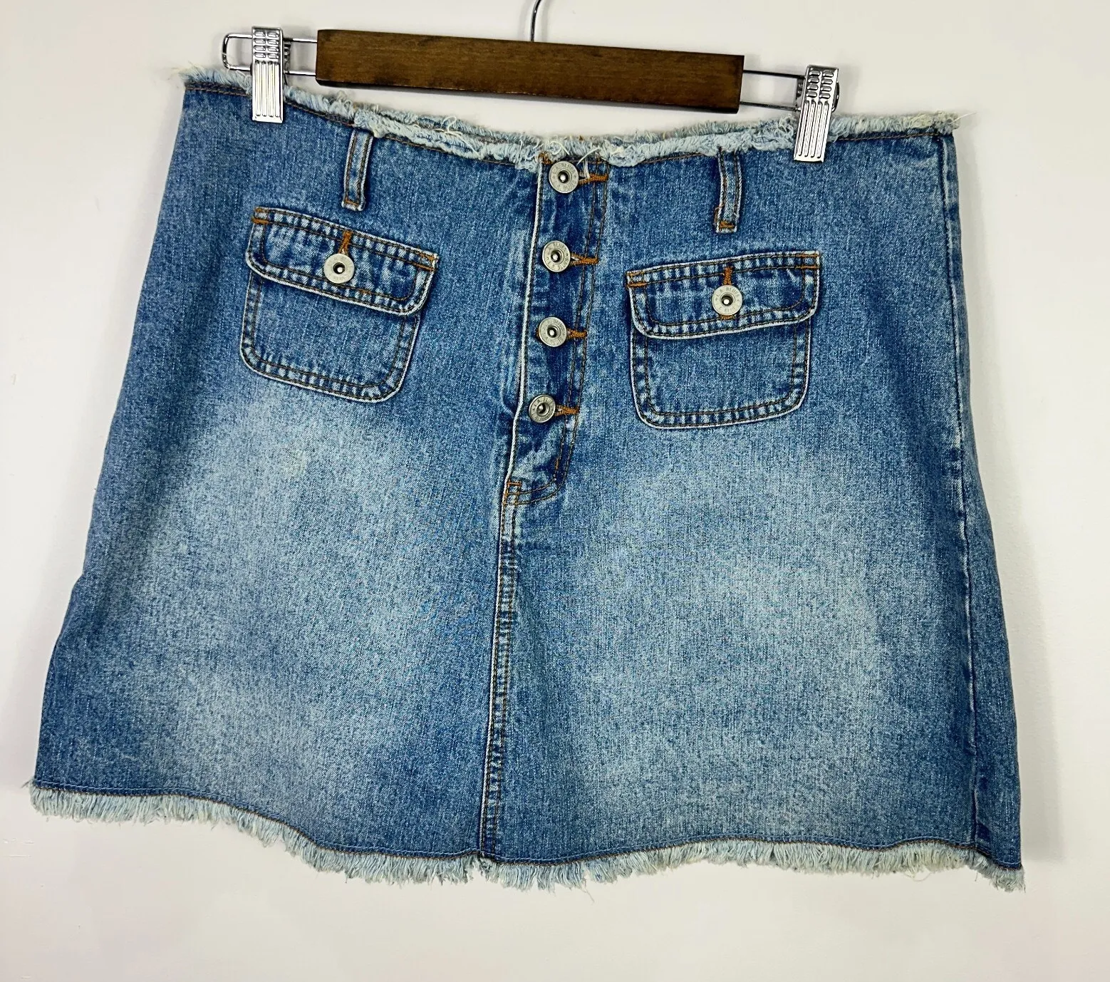 L.A. Blues Denim Skirt Women 14 High Rise Button Front Pockets 90s Vintage Y2K Authentic vintage 1990s L.A. Blues high-rise denim skirt in a classic medium wash. Features a full button front, raw frayed hem, and dual front flap pockets. True vintage piece made in Hong Kong from 100% cotton — sturdy, timeless, and Y2K-ready. No stretch. A-line silhouette with a mid-thigh length. Tagged size 14; see measurements for fit. Vintage 90s, Y2K, Retro Grunge, Indie Sleaze, Street Style, Festival, Boho Western Condition: Great vintage condition with natural fading and raw hem. No holes or stains. Measurements: * Waist: 17" flat * Length: 15.5" Fabric / Made in: 100% Cotton Made in Hong Kong