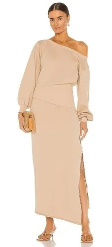 100% cotton Made in China Dry clean only Unlined Pull-on one-shoulder styling Ribbed neckline, waist, and cuffs Raw-cut hem with distressed side slit Revolve Style No. SERR-WD6 Manufacturer Style No. SR01-3297 Model Info Zinta is 5'10.5" and is wearing a size S Waist 24" Bust 34" Hips 34" Product measurements Shoulder seam to hem measures approx 52.5" in length