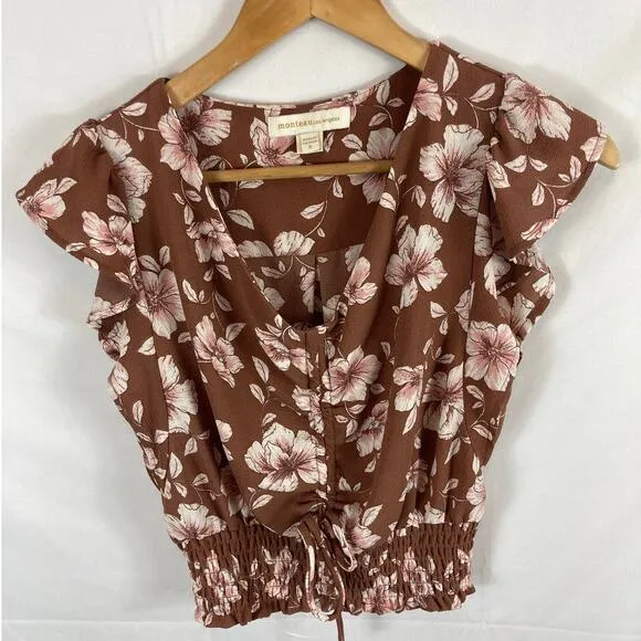 Monteau floral V Neck Cinched Blouse brown and pink crepe texture fabric great shape
