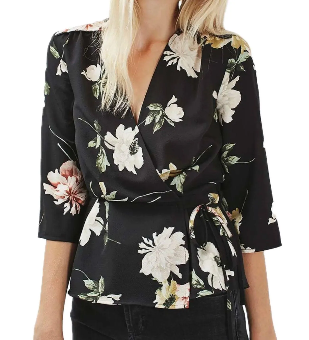 Topshop Floral Wrap Blouse. Elbow-length kimono sleeves and a lush floral print polish a light and d... Show more