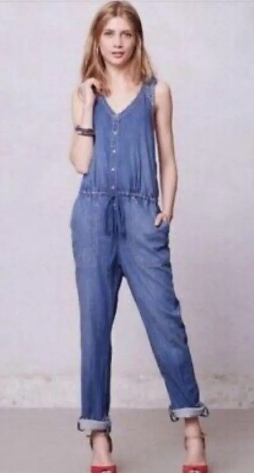 ANTHROPOLOGIE HOLDING HORSES Eyelet Chambray Denim Jean Jumper Overalls Jumpsuit Blue Size 12 - $44 (70% Off Retail) - From E