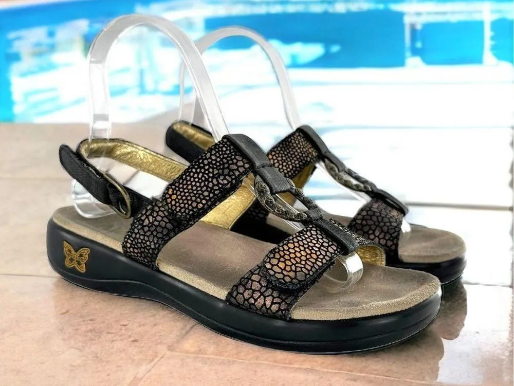 ALEGRIA Black & Gold Pebble Print Leather Sandals Features: Padded suede footbed Open toe Adjustable hook & loop closeures 1.25" high wedge heel Size 37 Good condition - wear/dark marks on the footbed