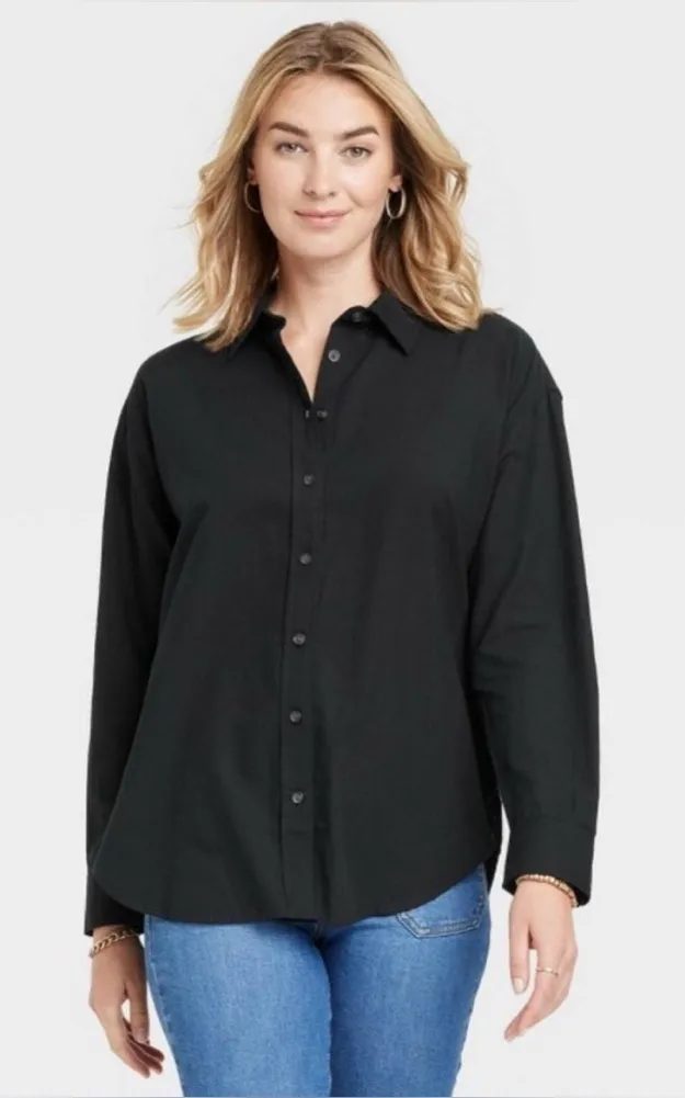 Black Measures 27” armpit to armpit 23” sleeve 32” length Women's Long Sleeve Oversized Button-Down... Show more