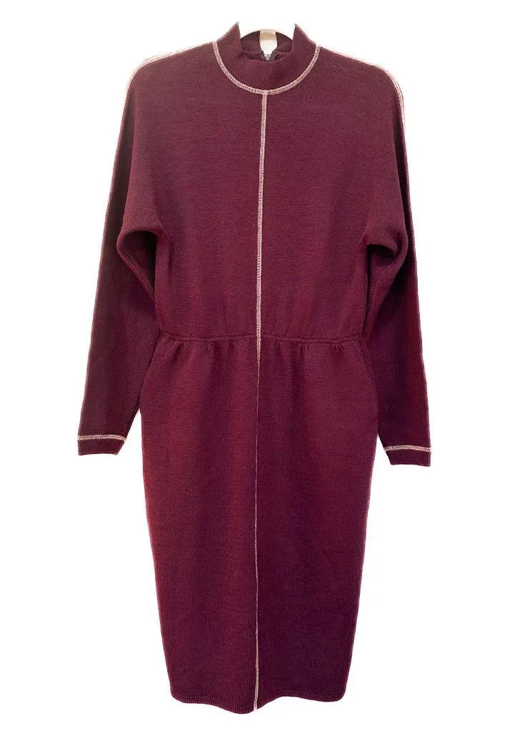 Vintage 1970s St. John dress in their signature weighty Santana knit. Deep Wine color with contrasting serged topstitching in gold. Dolman sleeve, tapered cuff, softly defined waistline and pockets! Label St. John by Marie Gray, circa 1970s. • Size Small (see measurements) • Unlined • Hook/zipper down the back • Excellent condition, very light signs of wear but no notable flaws