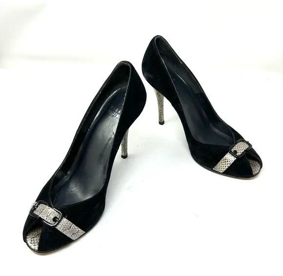 Authentic STUART WEITZMAN black suede, snakeskin, peep toe heels, made in Italy, size 8.5 Note: mad... Show more