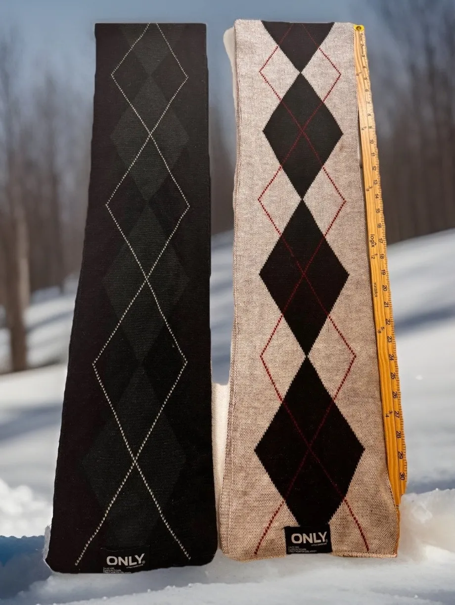 Wrap yourself in timeless European style with this striking argyle scarf. The classic diamond pattern in black and beige, accented with bold red threads, offers a sophisticated touch. Its versatile design makes it a perfect accessory for elevating your everyday look or adding a polished finish to an evening outfit. Ideal for adding a pop of color and pattern to a professional ensemble or a casual weekend ensemble. Measurements: • Length: 70 in • Width: 7 in Type: Scarf Department: Women Material: Polyester Style: Rectangle Scarf Pattern: Argyle/Diamond Theme: Preppy Fabric Type: Knit Accents: Logo Season: Fall, Winter Keywords: argyle scarf, European fashion, streetwear, classic pattern, winter accessory, fall fashion, sophisticated, stylish, neckwear, layered look, cold weather, bold accent Great preowned condition nice and soft