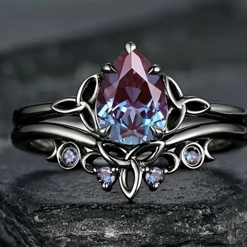 Beautiful gun metal gray ring with a pear-shaped gemstone. Features intricate detailing and small accent stones. Product Description: 2pcs Set Vintage Luxury Personality Rings, Keltic Knot & Teardrop Design, Synthetic February Birthstone Zirconia, Alloy Size: 6