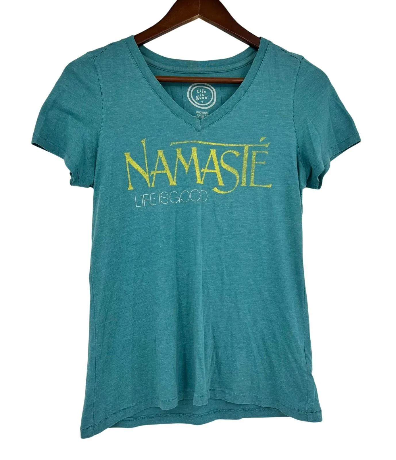 Life is Good NAMASTE Women Size Small blue green Short Sleeve V-Neck classic fit Tee short sleeve... Show more
