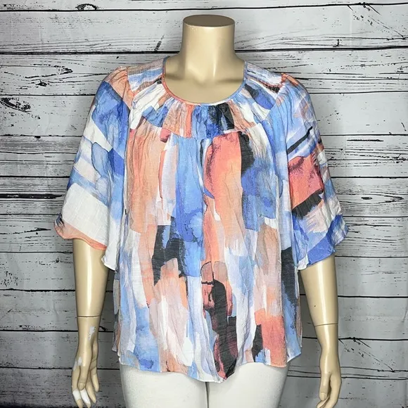 Zac & Rachel Woman Size 2X Watercolor Print Blouse. Smock Elastic. Keyhole with Button Closure (Back... Show more