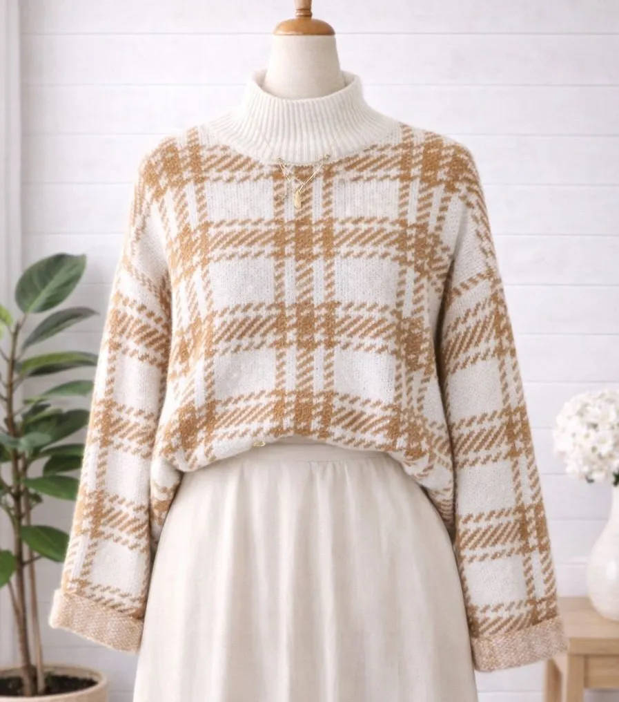 A new approach mock neck plaid sweater in white and mustard yellow. Long sleeves with drop shoulder... Show more