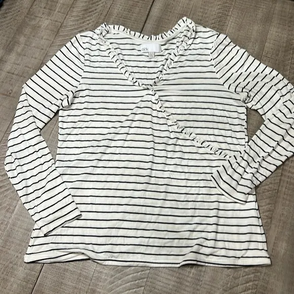 EUC Women’s Nordstrom Rack long sleeve white and black stripes ruffled faux wrap shirt.