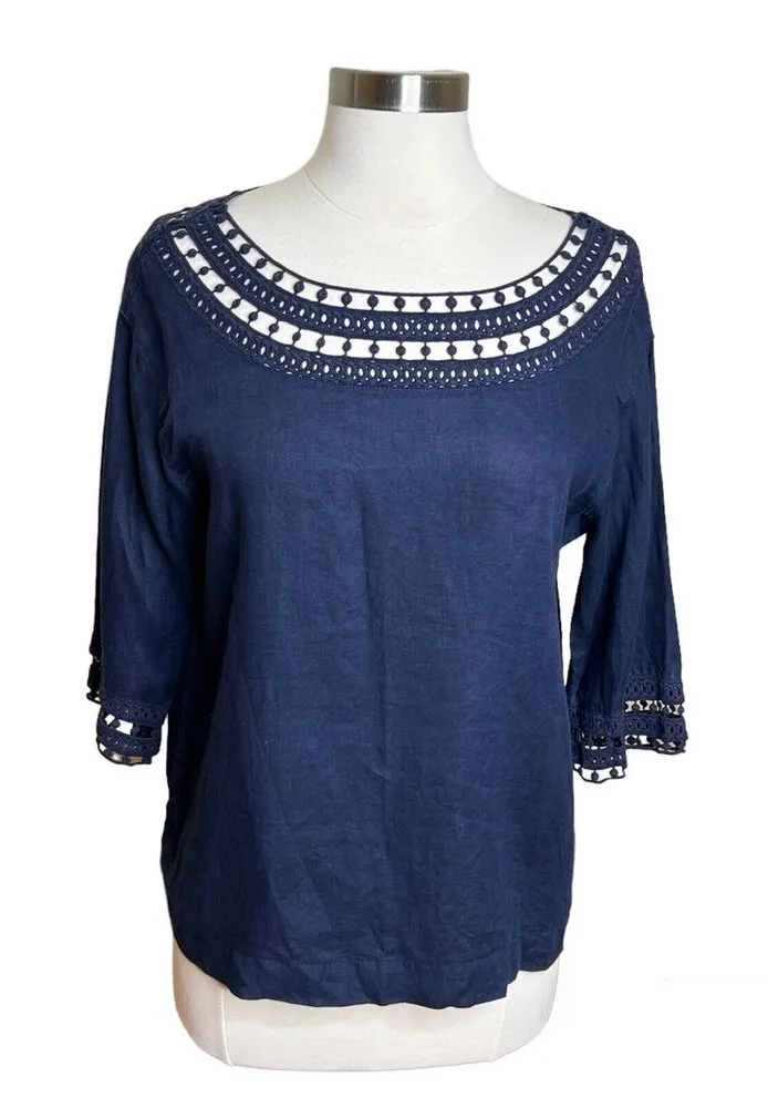 3/$30 J Jill Love Linen Top Small Petite Navy Blue 3/4 Sleeve Crochet Lace Boxy Size undefined - $19 - From Laura