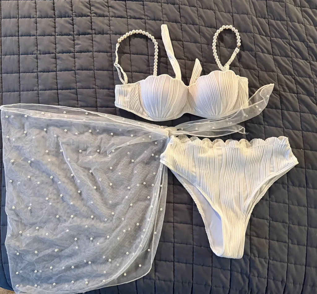 Beautiful 3-Piece Bridal Swimsuit set perfect for any pool/beach bachelorette! Adjustable pearl beaded straps and tie back top, high cut scalloped edge bottoms and a pearl embellished sheer sarong. Worn once in excellent like new condition.
