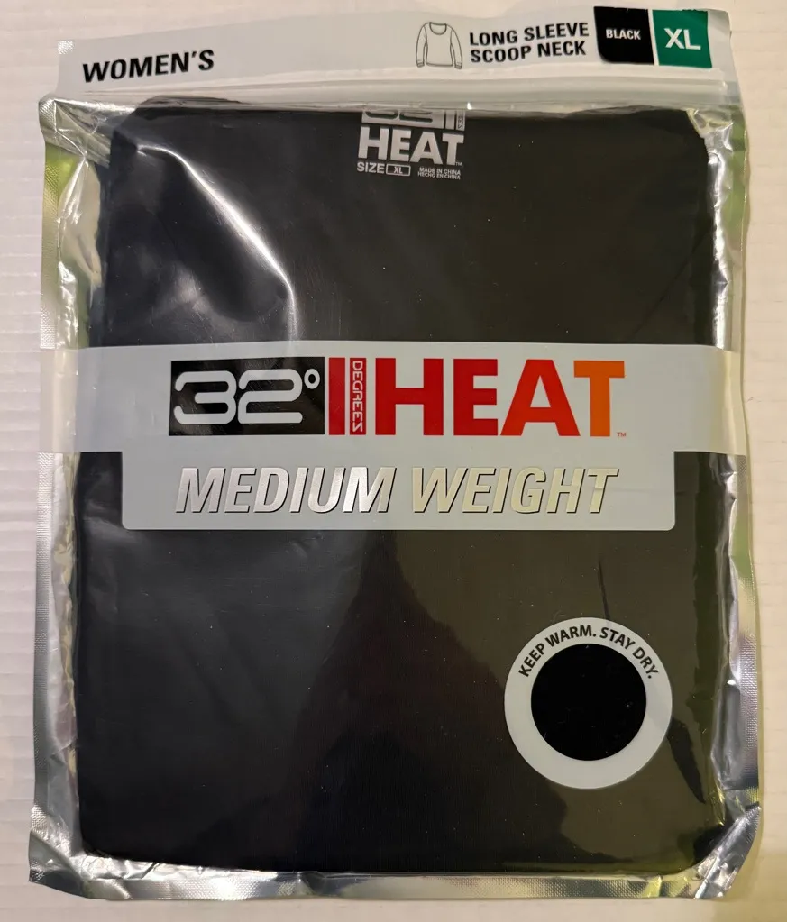 32 Degrees Heat Women's Long Sleeve Scoop Neck Medium Weight Shirt Size: XL Black This is a medium-weight thermal baselayer designed to retain body warmth and wick away moisture. The fabric is a blend of polyester, acrylic, and spandex, giving it a soft feel and stretch comfort. I have 2 of these shirts NWT in packaging. Please reach out for bundle price Pet and smoke free home