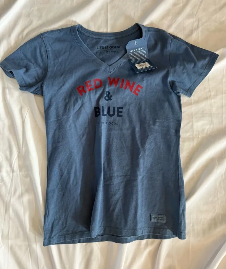 Soft blue tee with 'Red Wine & Blue' graphic. Comfortable and stylish.